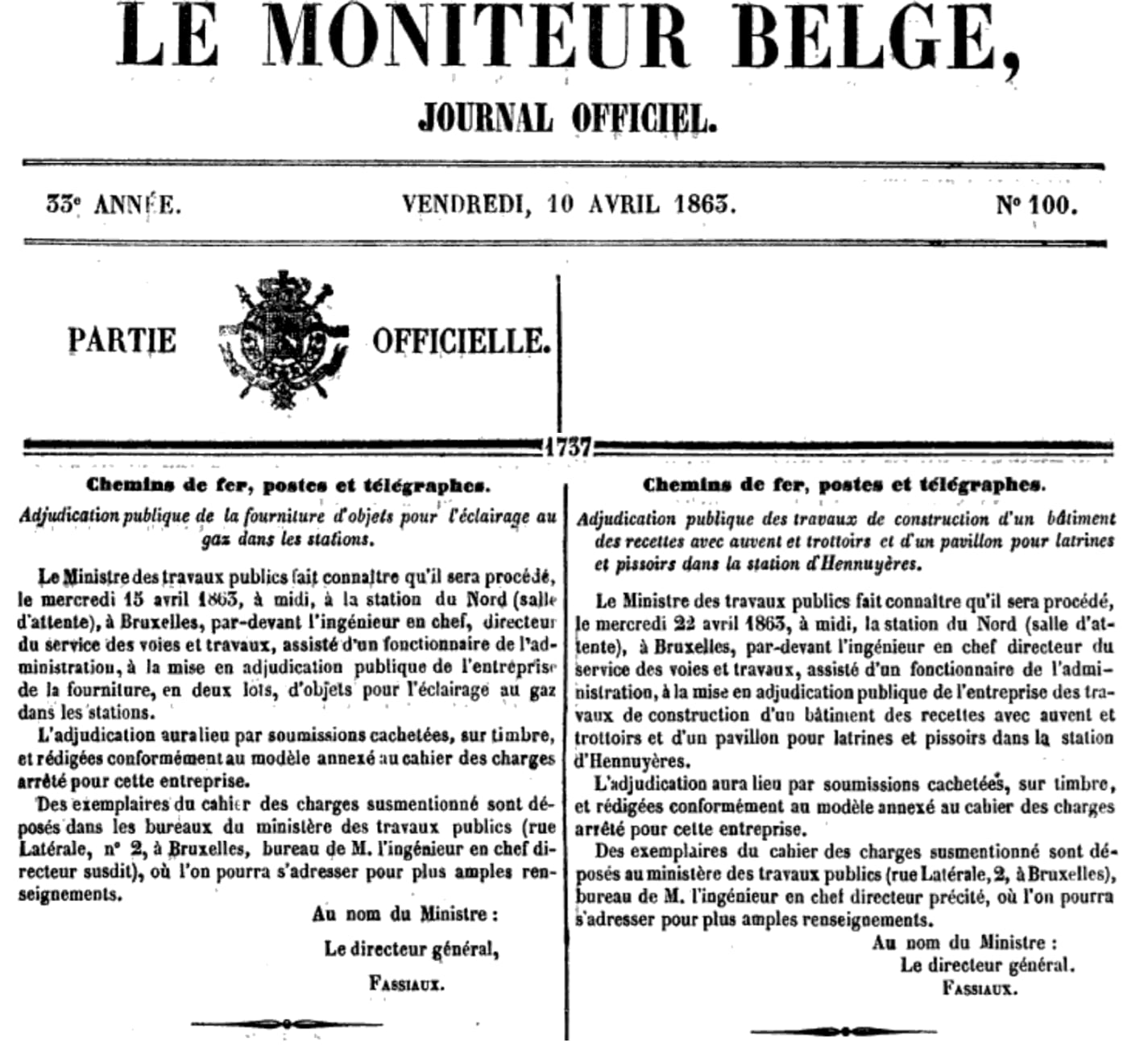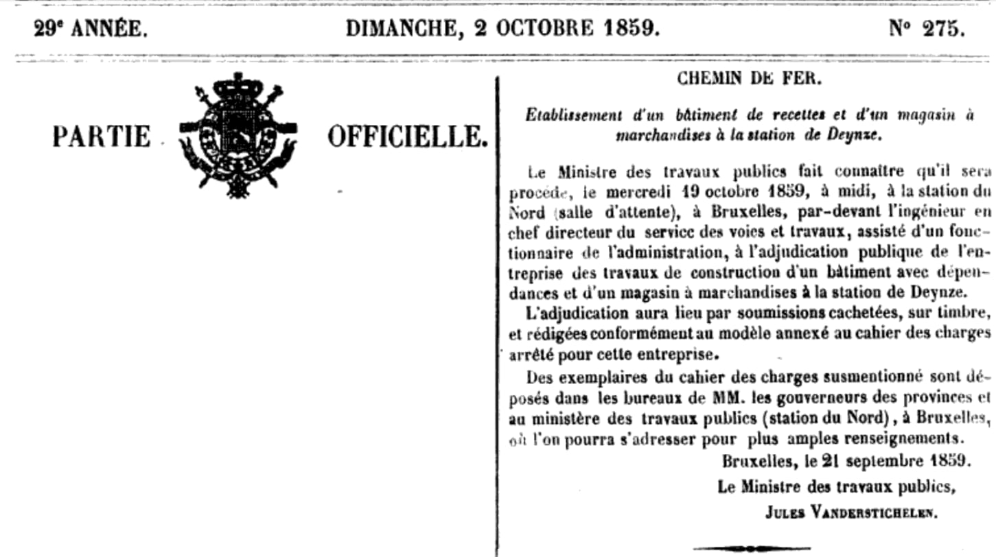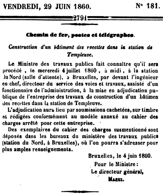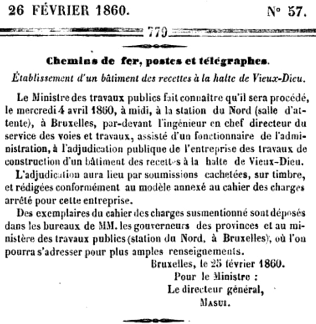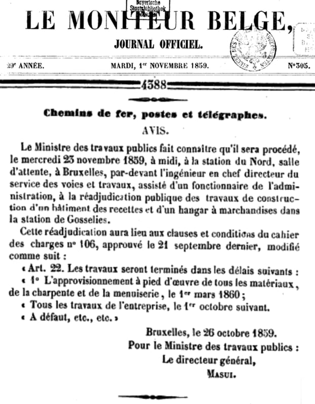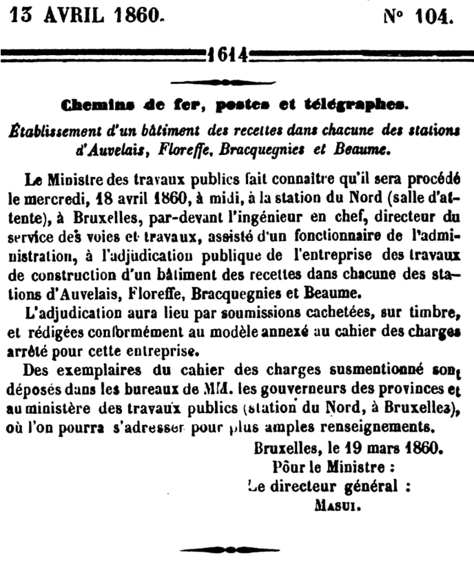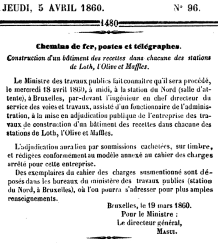 Le 5 avril 1860 : trois gares Lot, Morlanwelz-l'Olive, Maffle. Adjudication du 18 avril 1860.