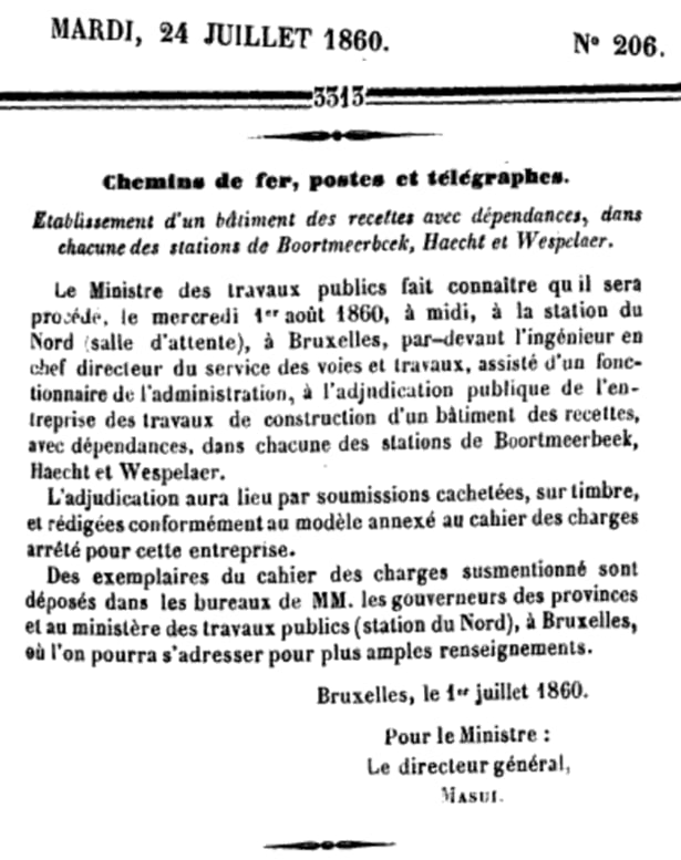 Le 24 juillet 1860 : Boortmeerbeek, Haecht, Wespelaer-Tildonk. Adjudication du 1 août 1860.