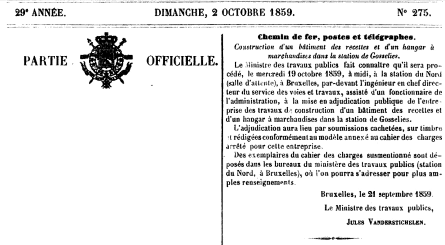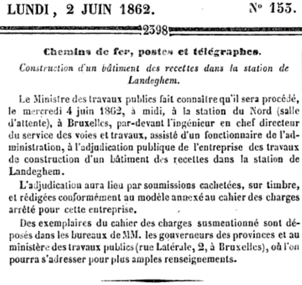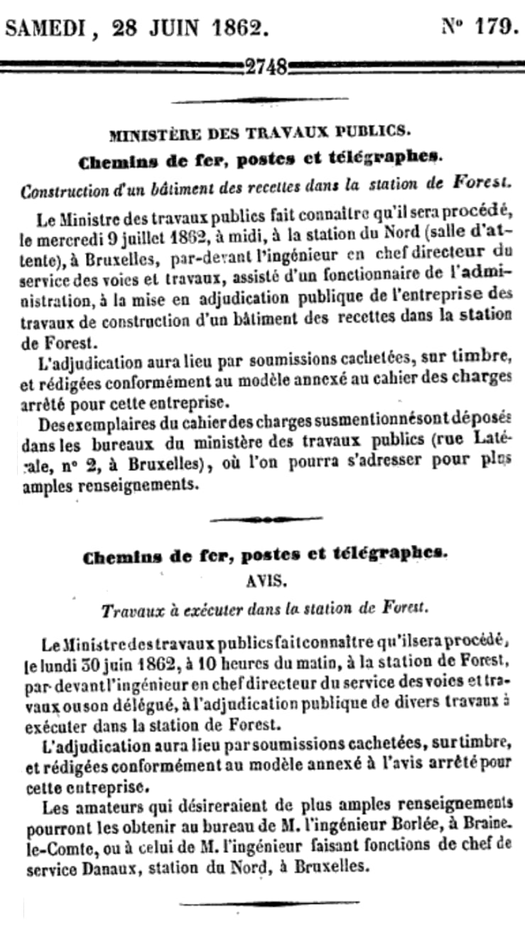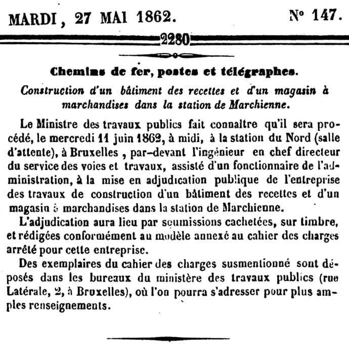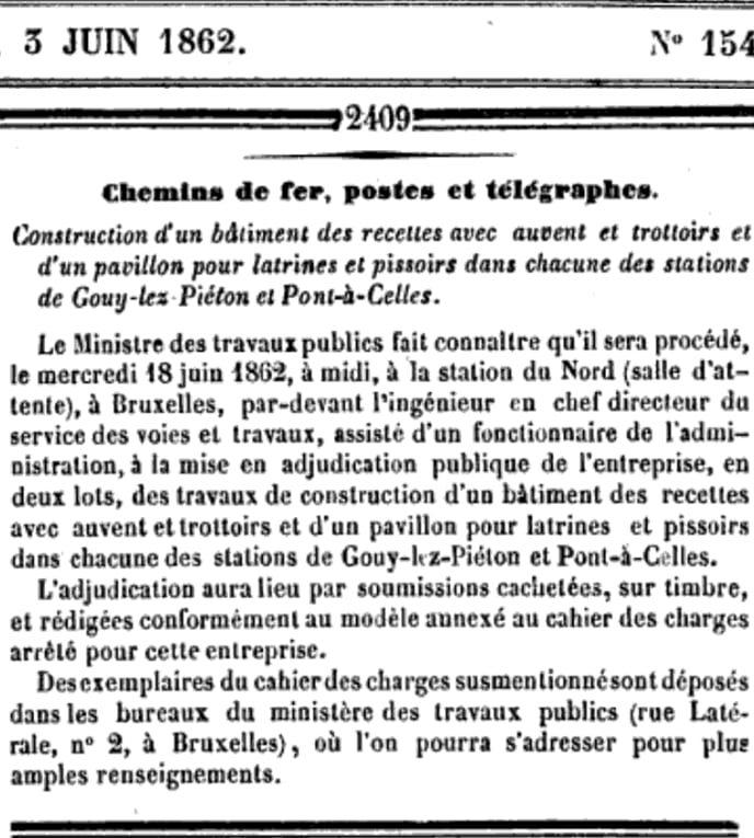 le 2 juin 1862: gares de Pont-à-Celles et Gouy-lez-Piéton. Adjudication du 18 juin 1862
