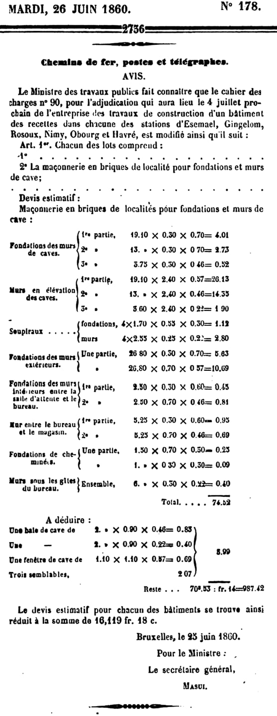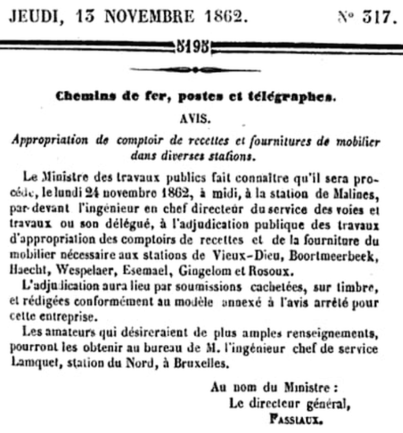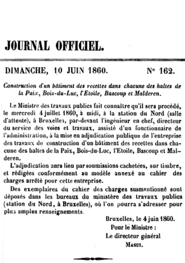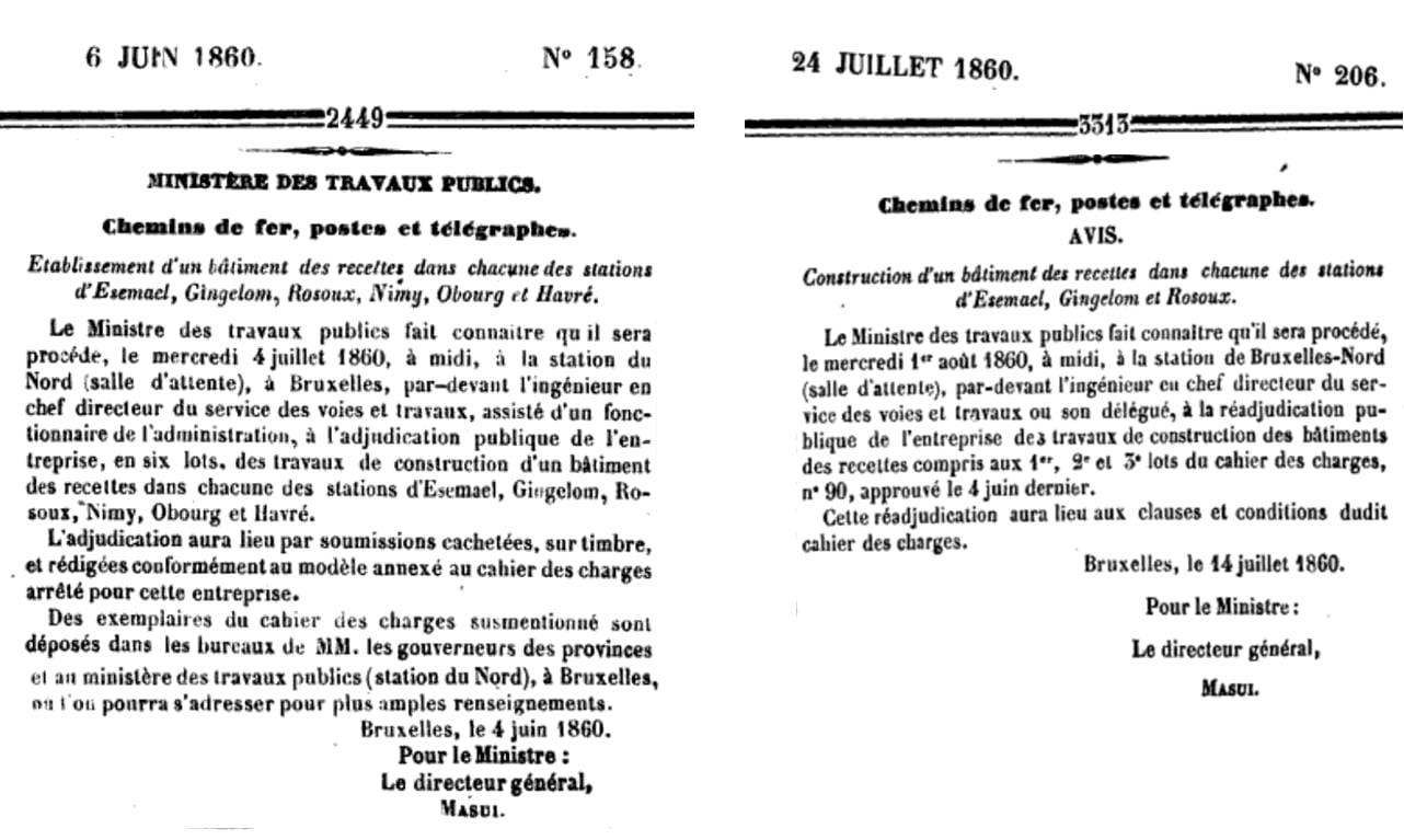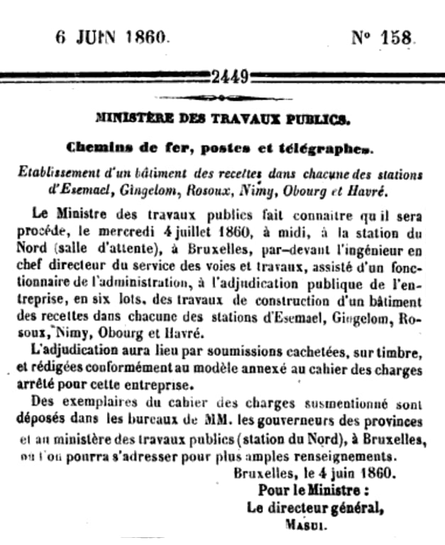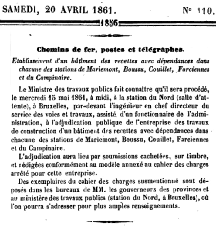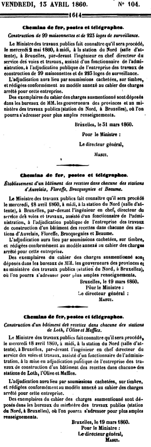 Le 5 avril 1860 : trois gares Lot, Morlanwelz-l'Olive, Maffle. Adjudication du 18 avril 1860.