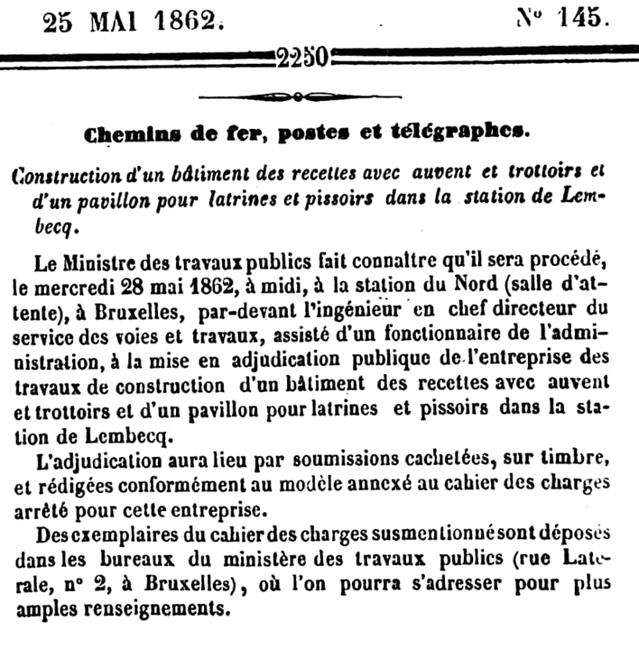 le 2 juin 1862: gares de Pont-à-Celles et Gouy-lez-Piéton. Adjudication du 18 juin 1862